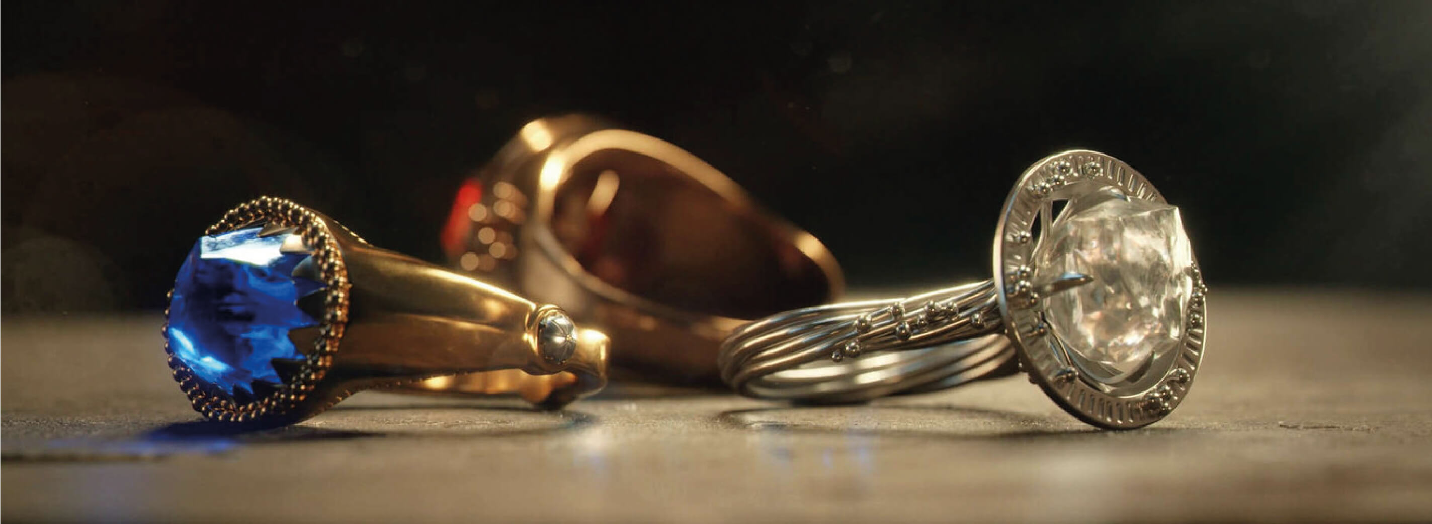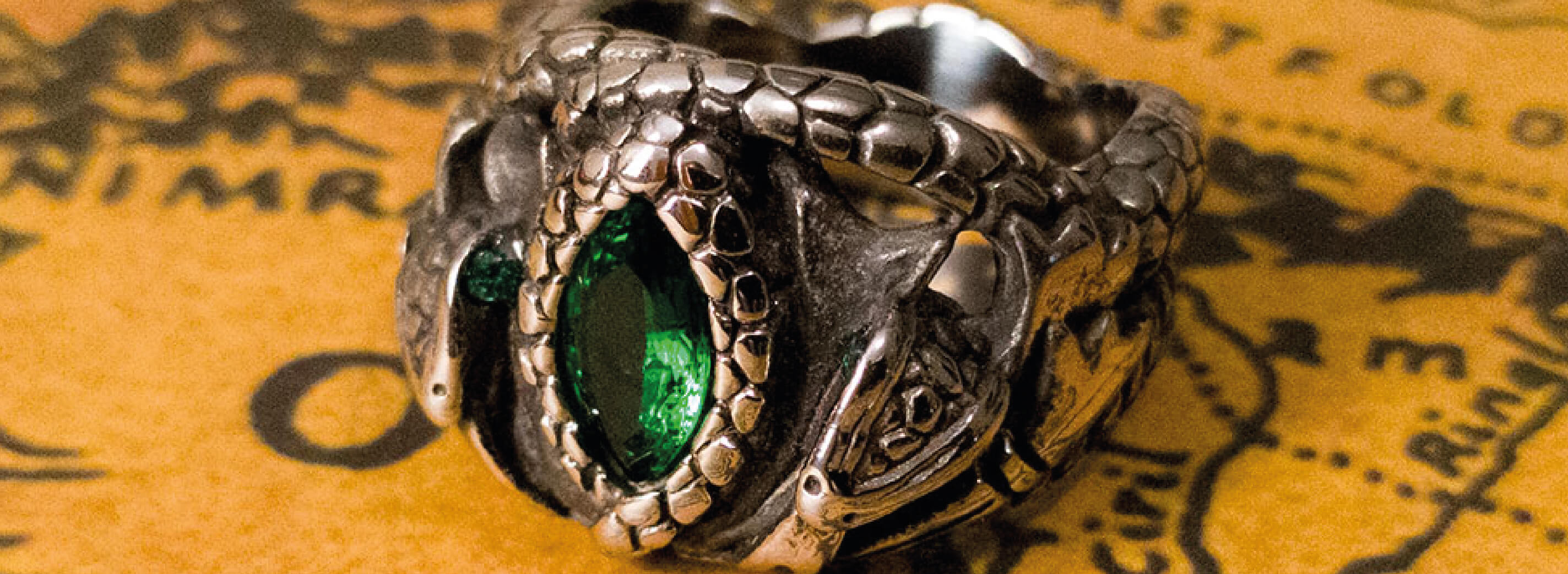Esta saga está repleta de detalles para personalizar el diseño del anillo de compromiso, más que para basarse en alguna historia dentro de la trama. Hay opciones que se inspiran en personajes como Aragorn, que porta el anillo de Barahir, el diseño en la argolla simula dos serpientes que se enlazan en una esmeralda como pieza central.
